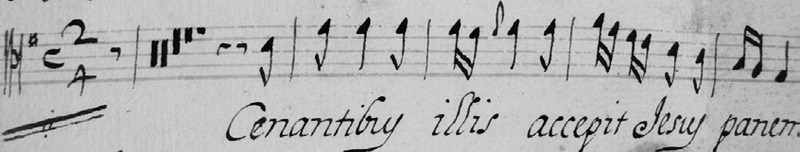 | Pàgina inicial > Motete â Solo al SSmº Stº / Con Flautas ó Violines / Cenantibus illis / P. Mt |